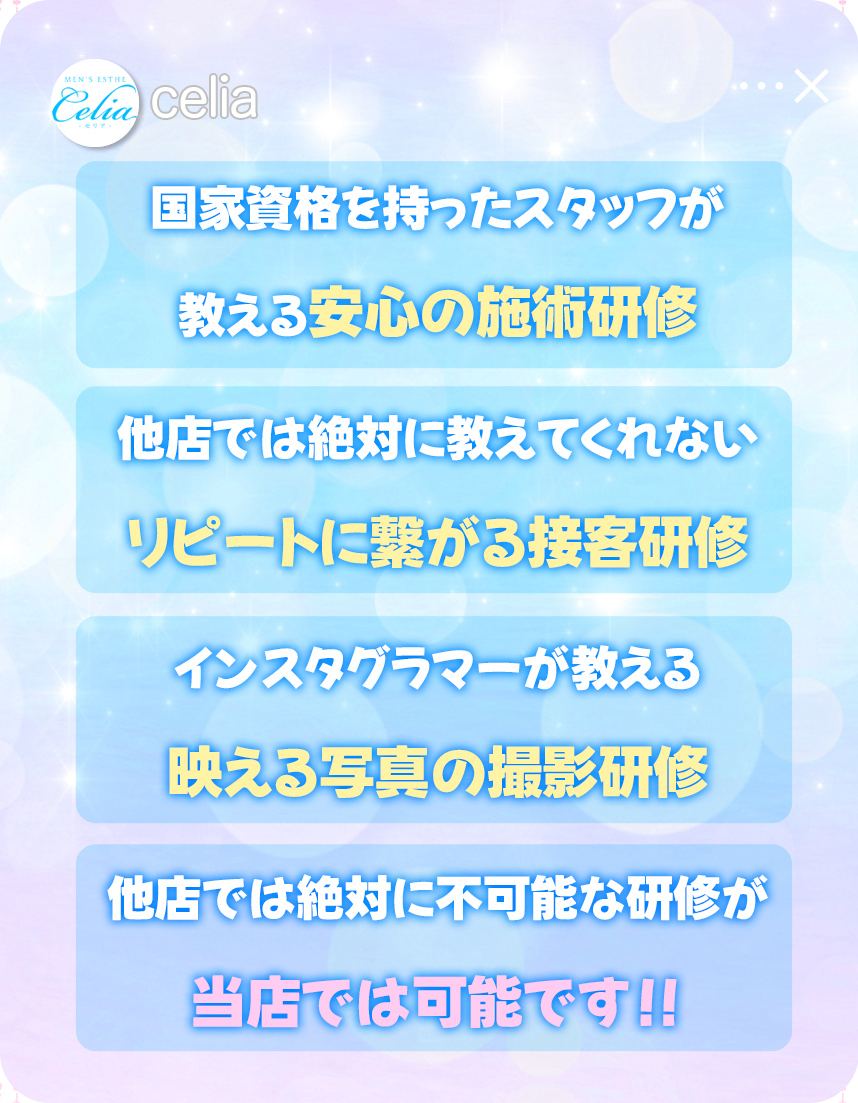当店の施術の流れなどを詳しく説明、講習させていただきます! また国家資格の持っている女性講習員から 丁寧に教えて頂けるので未経験の方でも簡単に覚えれる内容で安心こ内容となっておりますのでご安心ください!